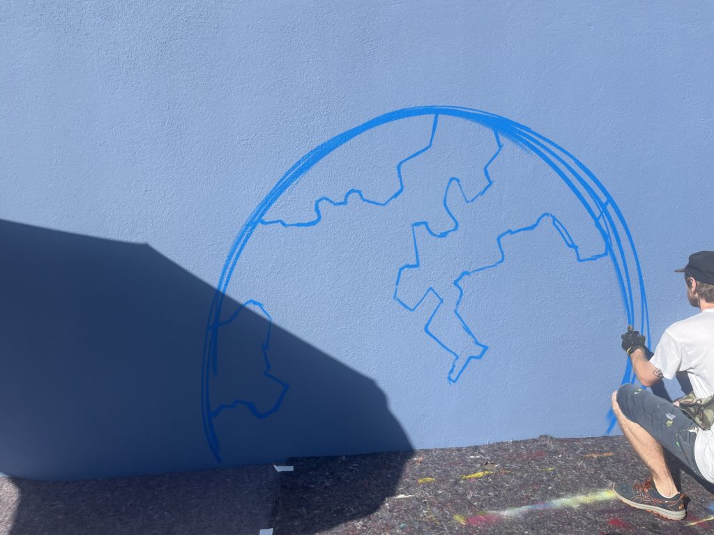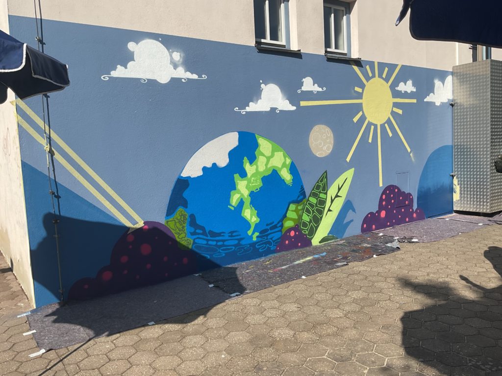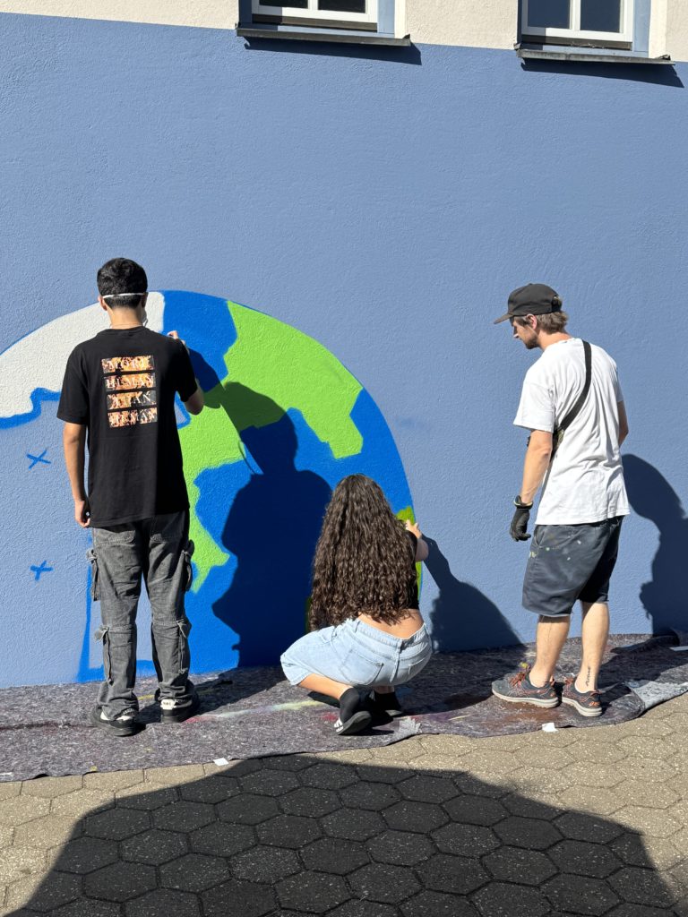 Die Sprayerinnen und Sprayer gestalteten die Weltkugel auf der Wand, wobei jedes Gruppenmitglied einen Kontinent übernahm. Später ergänzten wir die Gestaltung mit Motiven wie dem Mond, Wolken, der Sonne und Blättern. Alexander Feer zeichnete die Umrisse vor, die wir anschließend mit Farbe ausfüllten.